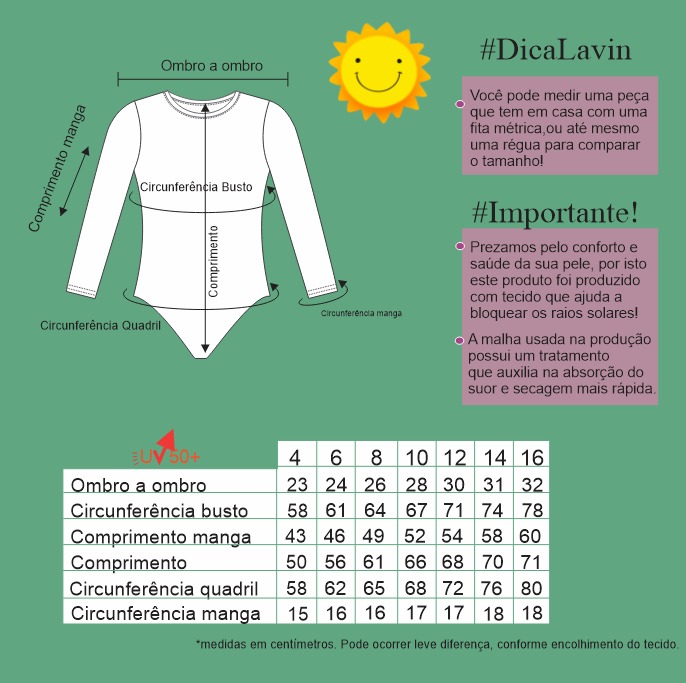 Prepare-se para o verão com a combinação perfeita de estilo, segurança e conforto! Nossos maiôs de manga longa são confeccionados em tecido tecnológico com Proteção UV 50+, garantindo que sua pequena se divirta com a máxima segurança sob o sol.